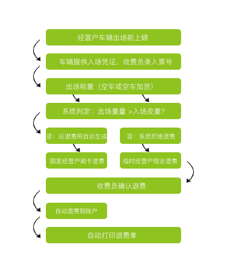 出場退費(fèi)時(shí),車輛必須提供入場時(shí)的進(jìn)場憑證。出場退費(fèi)的前提是出場重量大于入場時(shí)的皮重(入場皮重可能是核定皮重或是0);收費(fèi)員確認(rèn)退費(fèi)后,系統(tǒng)自動(dòng)提交數(shù)據(jù),并自動(dòng)打印退費(fèi)憑證,車輛可以出場。